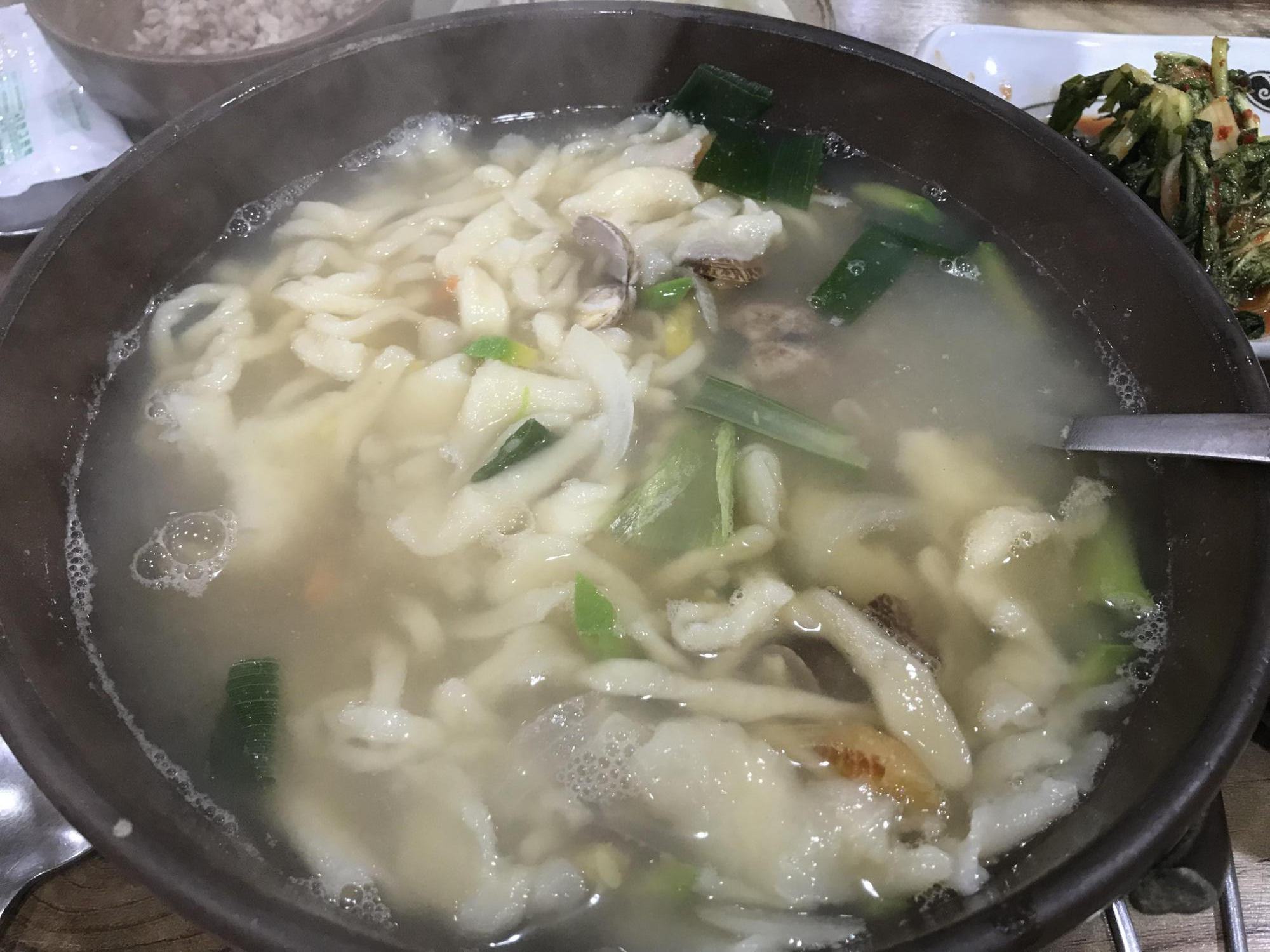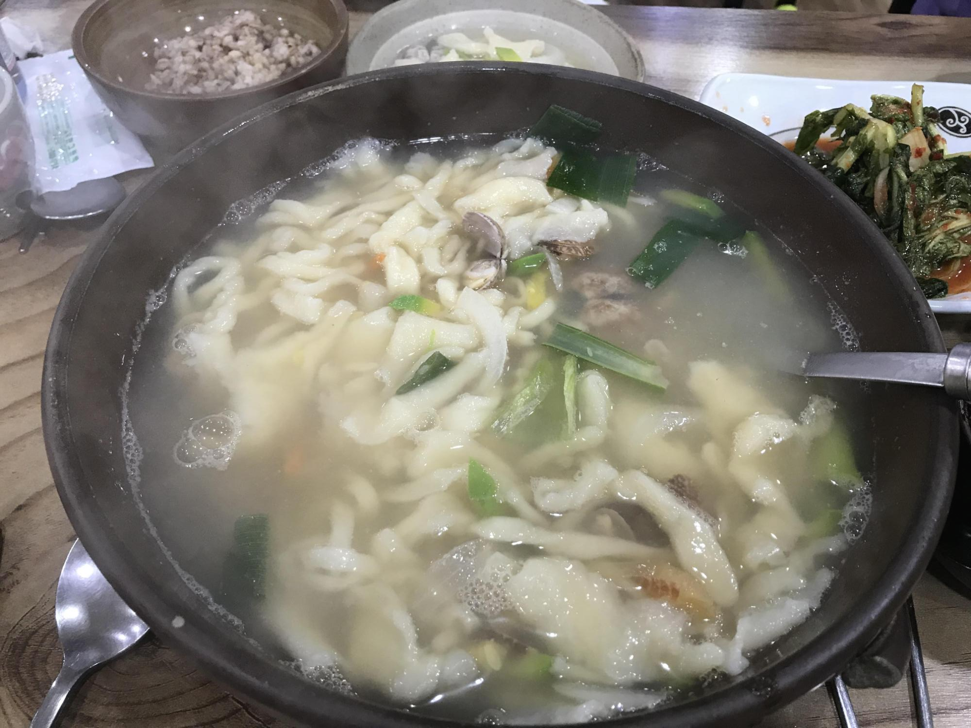이곳은 칼국수, 수제비, 칼제비 그리고 손만두(김치, 고기)가 주 메뉴입니다. 저희는 칼제비 3개와 모둠 만두를 시켰어요. 칼국수를 시키면 기본 반찬으로 열무김치와 배추김치, 보리밥을 내줍니다. 그럼 보리밥에 열무김치, 고추장을 넣고 비벼 먹지요. 아쉬운 부분은 참기름도 주면 좋겠는데, 참기름은 없어요. 칼국수 가격은 7,000원 내외입니다.